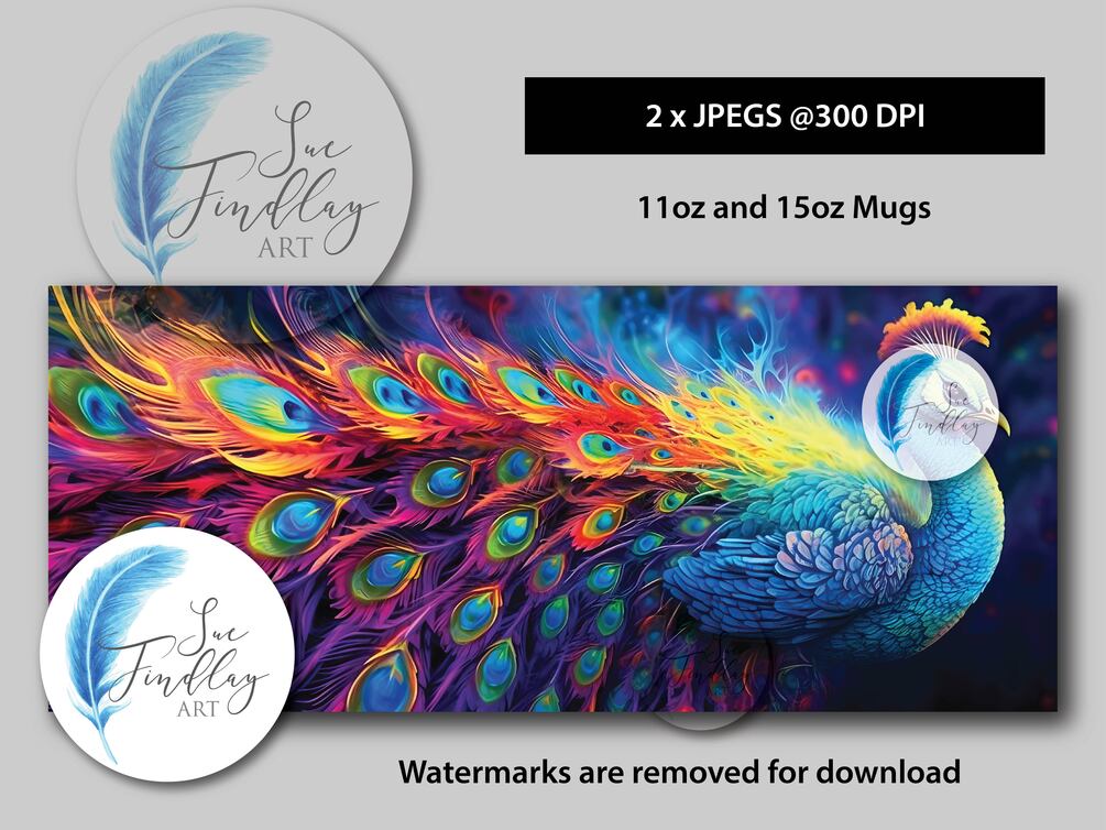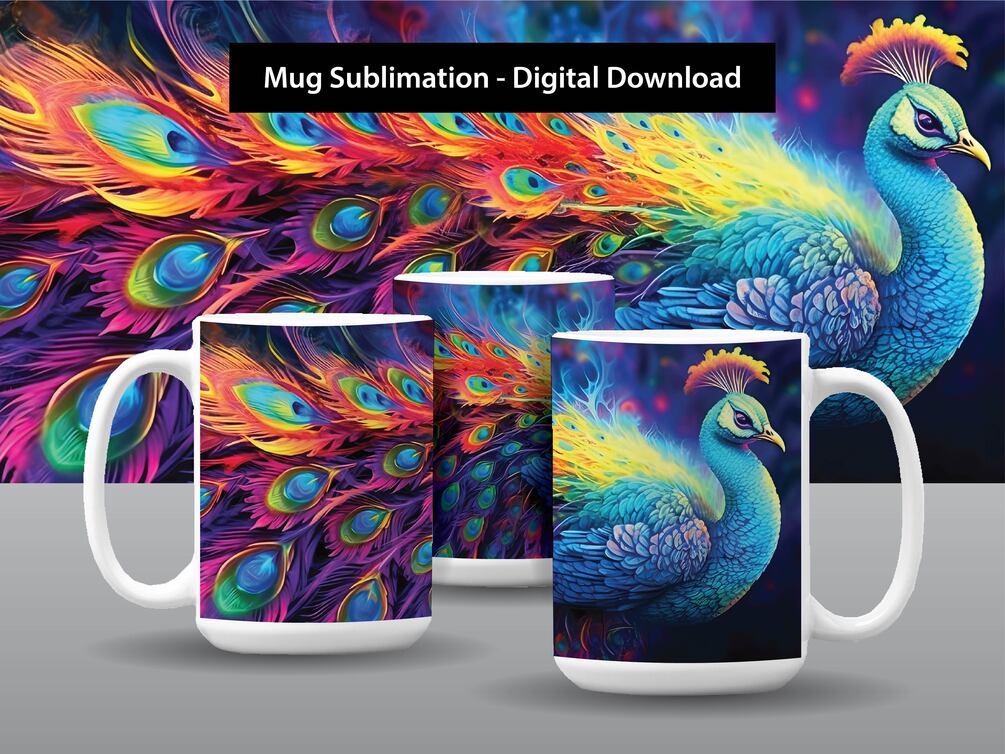 Neon Peacock Sublimation Mug Wrap Design | 11oz 15oz | Printable Download | High Resolution JPG